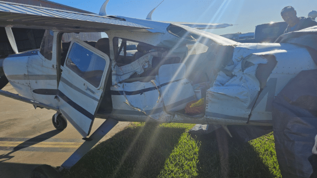 The passenger in the Grumman wrote, “With our flaps not operational, we couldn’t slow fast enough and plowed into his plane as he turned. The prop tore a hole in the left side of his fuselage and destroyed the side of his aircraft. Thankfully he had no passenger on the backseat or it would have been fatal. In our aircraft, the impact was devastating with aluminum crumpling and glass exploding everywhere. My shoulder pushed through the window and I sustained slight external injuries. But thankfully everyone was ok. The planes not so much, both are likely totaled. This video captures the moment.”