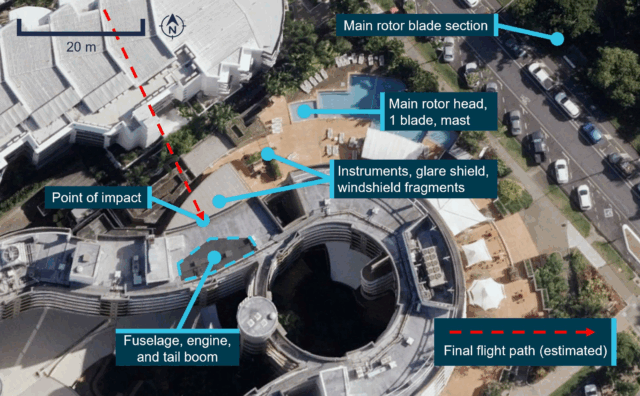The main rotor struck the building first, with parts of the blades found in the top floor hotel rooms. The rest of the helicopter was on the roof, with the cockpit, systems and engine severely damaged in the impact. The fuel caught on fire.