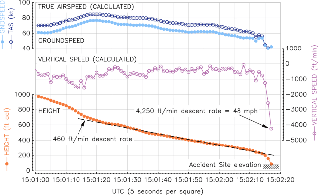 The left wing dipped. It struck the top of a 15-metre/50-foot tree. This threw the aircraft into a roll and leftward yaw. The Piper’s descent rate spiked to 4,250 feet per minute. That’s 48 mph/77km/h straight down.