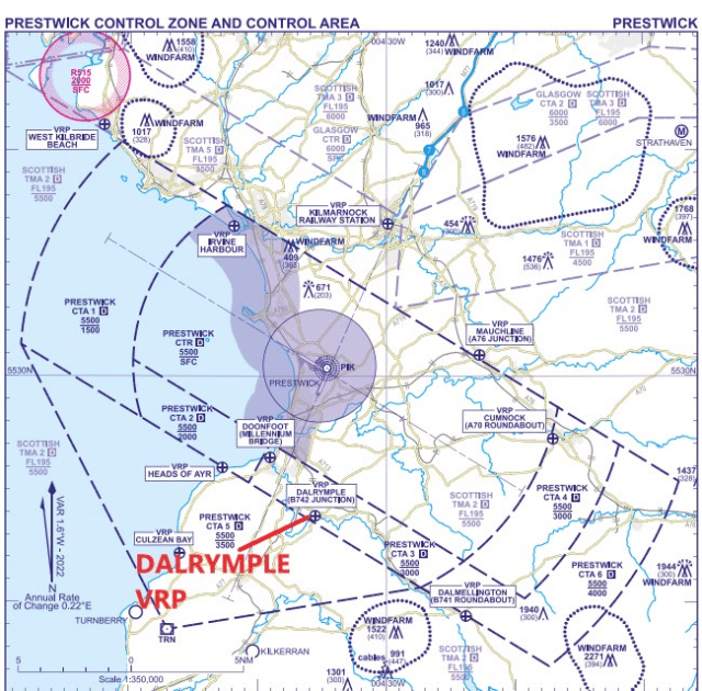 The crash happened on approach to Glasgow Prestwick Airport, which serves the west of Scotland with two long asphalt runways. The primary runway is 12/30 with 2,986 metres, the longest commercial runway in Scotland. Curious about the use of “commercial” as a qualifier, I searched to discover that there is a longer military runway at Campbeltown (Machrihanish), 3,049 metres, built to handle large military aircraft as well as act as an emergency landing site for the NASA Space Shuttle. Although Campbeltown Airport is now commercial, the current operational length is 1,750 metres making Prestwick the longest runway in Scotland, no qualifier needed. There is a second perpendicular runway, cited in the report and on the chart as 03/21 with 1,905 metres . A month after the accident the runway was updated to 02/20.