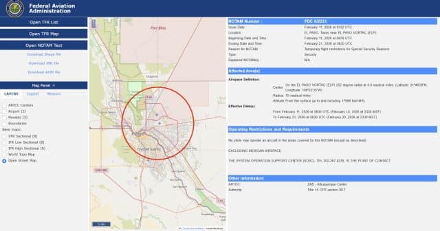 On the 10th of February, the FAA abruptly issued a temporary flight restriction shutting down all airspace below 18,000 feet within 10 miles of El Paso International Airport, initially for 10 days, a scale of closure not seen since September 11, 2001. The temporary flight restriction warned that violating aircraft could be “intercepted, detained and questioned” and that deadly force could be used against any aircraft posing an imminent security threat.