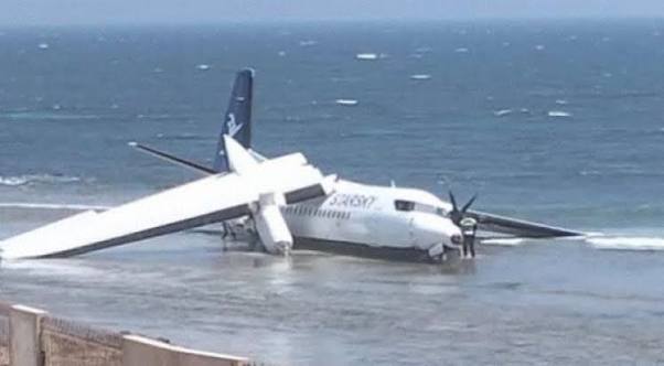 Somalian Fokker 50 badly damaged after overrunning onto Mogadishu beach