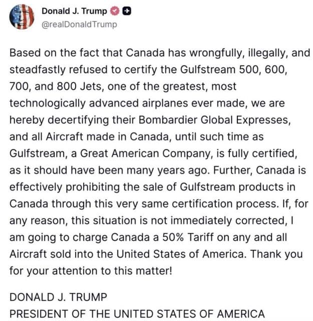 Based on the fact that Canada has wrongfully, illegally, and steadfastly refused to certify the Gulfstream 500, 600, 700, and 800 Jets, one of the greatest, most technologically advanced airplanes ever made, we are hereby decertifying their Bombardier Global Expresses, and all Aircraft made in Canada, until such time as Gulfstream, a Great American Company, is fully certified, as it should have been many years ago. Further, Canada is effectively prohibiting the sale of Gulfstream products in Canada through this very same certification process. If, for any reason, this situation is not immediately corrected, I am going to charge Canada a 50% Tariff on any and all Aircraft sold into the United States of America. Thank you for your attention to this matter!